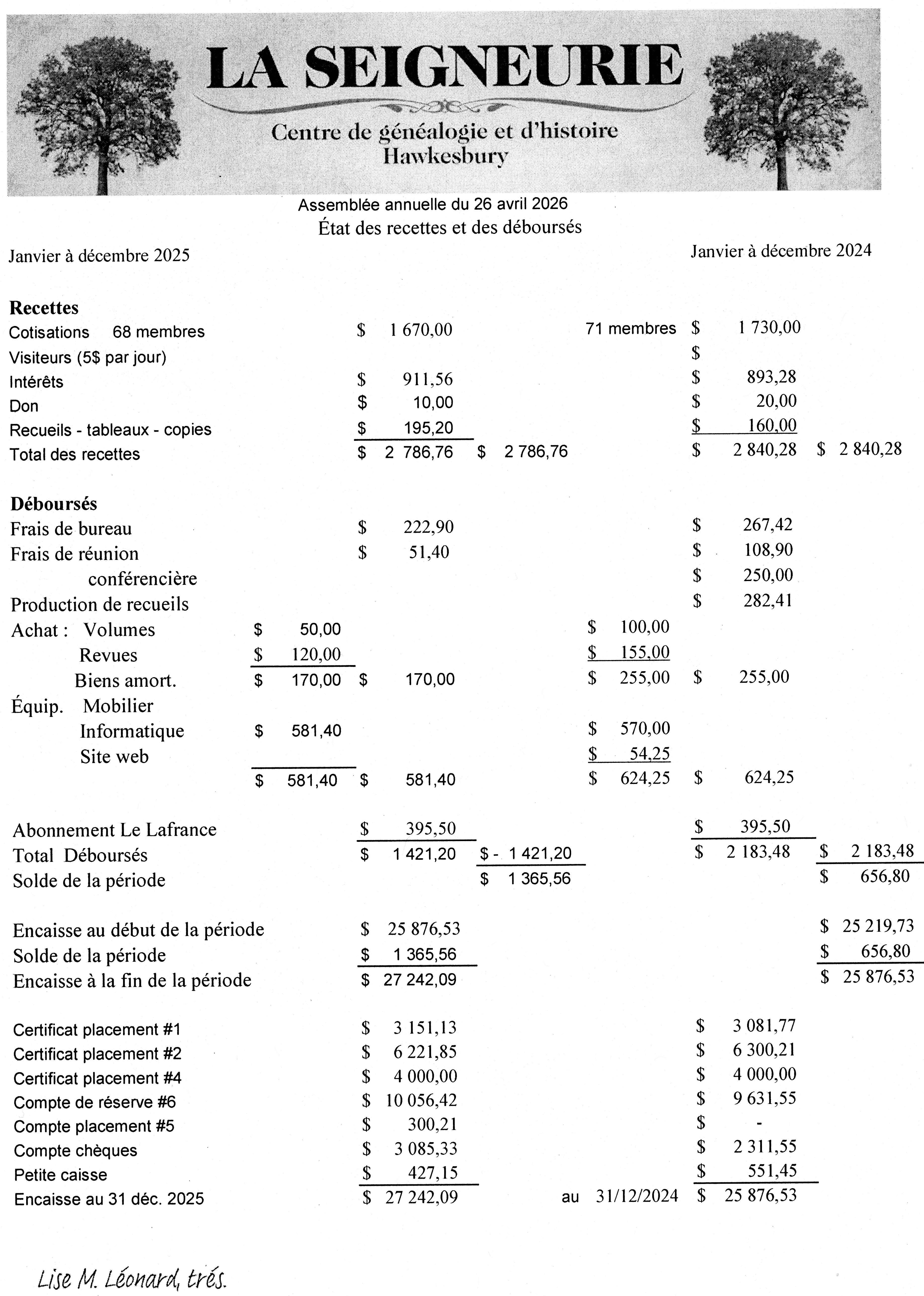 2025 et le rapport de l’état des recettes et des déboursés pour l’année 2025.